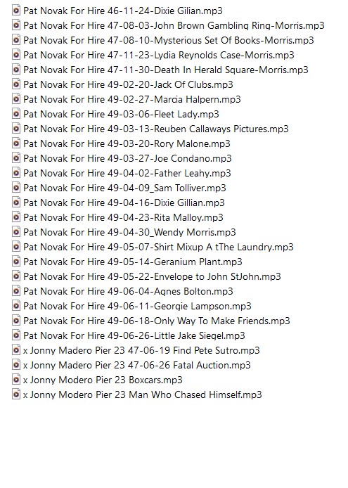 Pat Novak, for Hire is an old-time radio detective drama series which aired from 1946 to 1947 as a West Coast regional program (produced at KGO in San Francisco) and in 1949 as a nationwide program for ABC. The regional version originally starred Jack Webb in the title role, with scripts by his roommate Richard L. Breen. When Webb and Breen moved from San Francisco to Los Angeles to work on an extremely similar nationwide series, Johnny Madero, Pier 23, for the Mutual network, Webb was replaced by Ben Morris and Breen by other writers. In the later 1949 network version, Jack Webb resumed the Novak role, and Breen his duties as scriptwriter. The series is popular among fans for its fast-paced, hard-boiled dialogue and action and witty one-liners. Each episode of the program, particularly the Jack Webb episodes, follows the same basic formula; a foghorn sounds and Novak's footsteps are heard approaching. He then pauses and begins by wearily saying "Sure, I'm Pat Novak... for hire" (in one episode, "Rory Malone", he opens with "Sure, I'm Pat Foghorn..."). The foghorn repeats and leads to the intro theme, during which Novak gives a monologue about the waterfront and his job renting boats. Jack Webb narrates the story and plays the titular character. A downtrodden cynic, Novak throws off such lines as "Around here a set of morals won't cause any more stir than Mother's Day in an orphanage". He then relates a story about the trouble in which he found himself the past week.